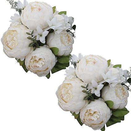 Xiuer 2 Pcs Vintage Peony Flowers Fake Artificial Peony Flowers Bouquet Wedding Home Kitchen Table Bridal Diy Decoration Milk White